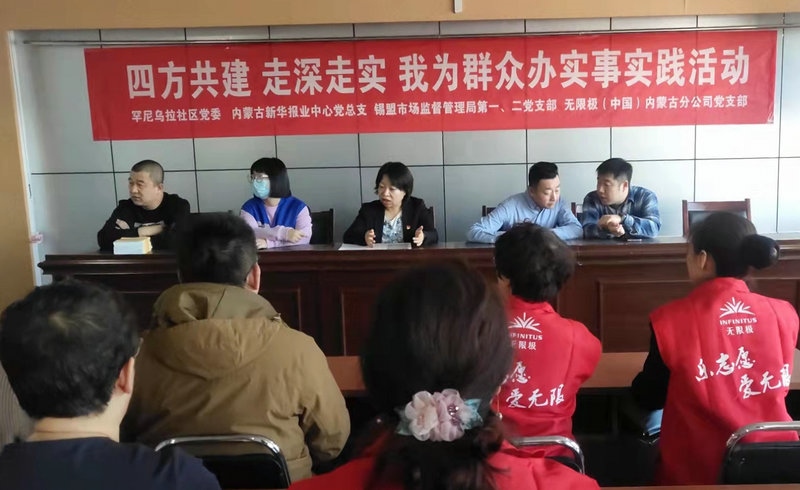 北疆新聞網、北疆新聞APP、北疆云消息 為慶祝中國共產黨成立100周年,將“我為群眾辦實事”落到實處,12月8日,內蒙古新華報業(yè)中心黨總支、無限極(中國)內蒙古分公司黨支部,聯合罕尼烏拉社區(qū)黨委、錫林浩特市市場監(jiān)督管理局第一、第二黨支部,走進錫林浩特市罕尼烏拉社區(qū),開展“四方共建 走深走實 我為群眾辦實事”主題實踐活動。20名黨員干部與志愿者代表齊聚一堂,開展黨史學習,重溫紅色歷史,并針對優(yōu)化營商環(huán)境、黨建經驗進行了互動交流,共話黨建工作的重要意義。座談會上,黨員干部暢所欲言,氣氛熱烈。