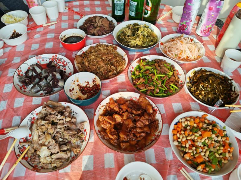 忙活了一上午,紅白相間的桌布上各類菜品早已擺得滿滿當(dāng)當(dāng),除了位居主位的殺豬菜,還多了許多“衍生作品”:醬燜肉、汆白肉、蒜苔炒肉、酸菜炒肉、涼拌豬肝、豬血腸、涼拌海帶條、芥菜絲……圍坐一圈的不止家人,還有左鄰右舍。無需主人過多招呼,筷子便紛紛探向鍋中。窗外寒風(fēng)漸歇,霧氣也被陽光驅(qū)散,而在溫暖的屋子里,鍋氣蒸騰,模糊了窗上的冰花,也潤濕了每一雙帶著笑意的眼睛。這不僅僅是一頓飯,更是鄉(xiāng)里鄉(xiāng)親們對生活最熱烈的擁抱?! ?/p>