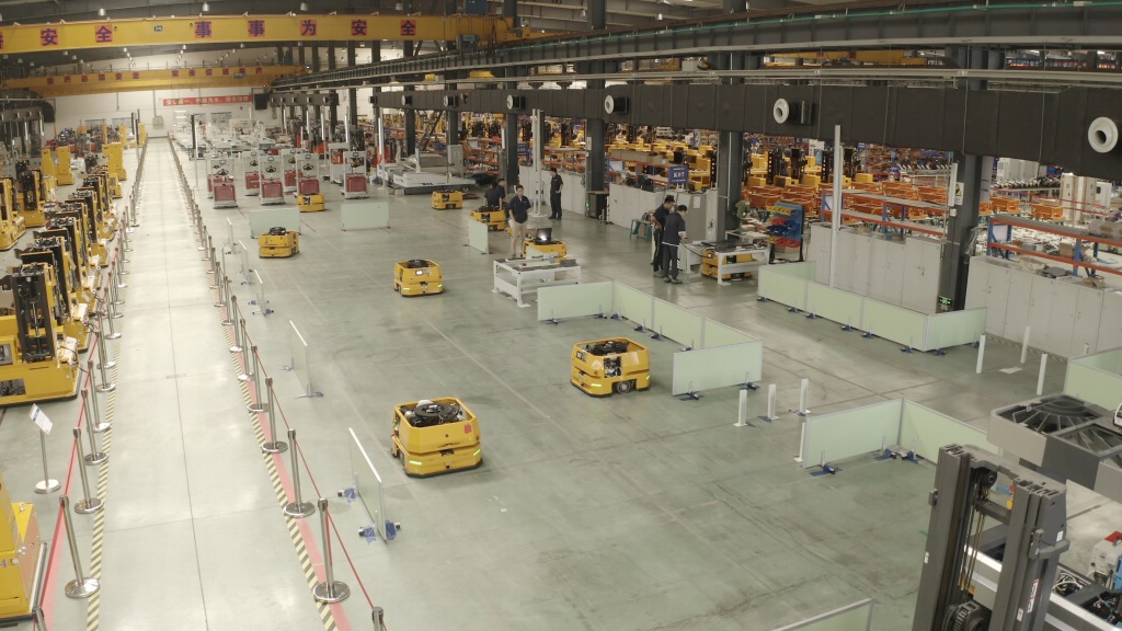 在長春一汽解放J7智能工廠內(nèi),還未加裝輪胎的車體通過移動機器人,從一個工位來到另一個工位,與工人配合著完成裝配工作。