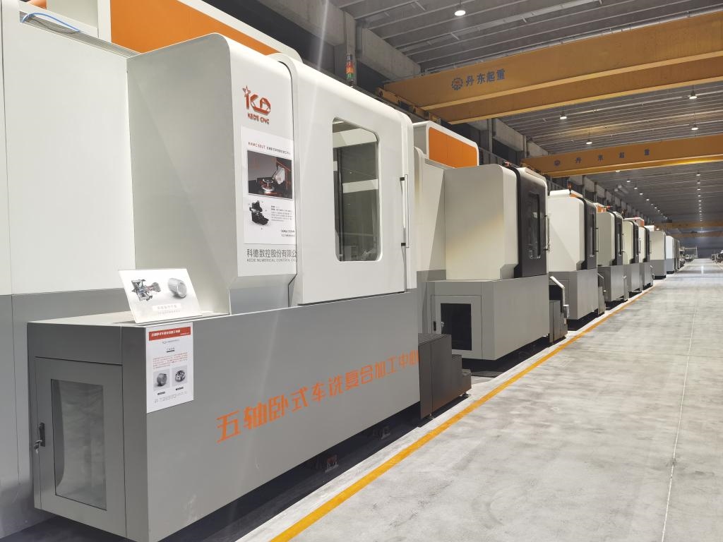 大連光洋科技集團恒溫恒濕地藏式生產(chǎn)車間里的五軸臥式車銑復(fù)合加工中心。(新華社記者鄒明仲攝)