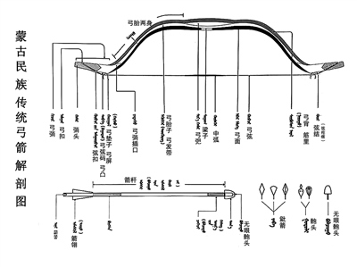 “用彈性很好的竹子或木頭作為弓胎,制作弓里的牛角一般是水牛角,或者巖羊角也可以,貼在弓外的牛筋來自春天的牛,這時候牛比較瘦,牛筋油脂少、有彈性。膠則是用魚膘、魚皮、豬皮、馬皮等熬制的膘膠,最外面還要貼一層蛇皮或者樺樹皮,防止受潮?!敝Z敏朝魯說。