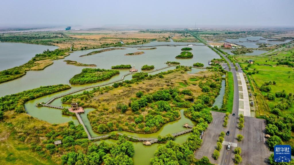 夏日的東營市黃河入??跐竦?,綠草連天、百鳥翔集。