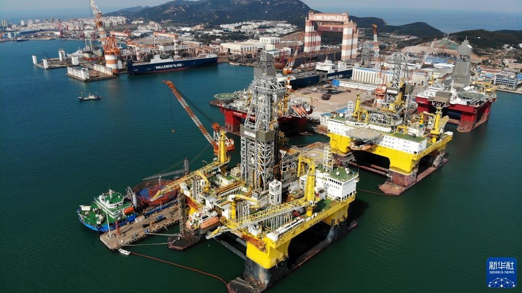 “藍(lán)鯨1號”(前右)及姊妹平臺“藍(lán)鯨2號”(前左)在其生產(chǎn)基地中集來福士海洋工程有限公司煙臺基地進(jìn)行維護(hù)和保養(yǎng)(2021年10月18日攝,無人機(jī)照片)。新華社記者李紫恒攝