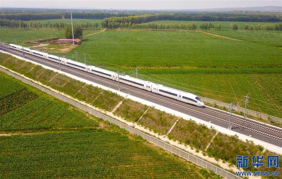 一列“和諧號(hào)”動(dòng)車(chē)組列車(chē)行駛在內(nèi)蒙古赤峰市元寶山區(qū)的田野間(6月30日攝,無(wú)人機(jī)照片)。 當(dāng)日,隨著G8382次“和諧號(hào)”動(dòng)車(chē)組列車(chē)從內(nèi)蒙古赤峰站緩緩駛出,喀左至赤峰高鐵全線開(kāi)通運(yùn)營(yíng)。該線經(jīng)喀左站與京沈高鐵接軌,內(nèi)蒙古赤峰地區(qū)由此接入全國(guó)高鐵網(wǎng)。 新華社記者 彭源 攝 -