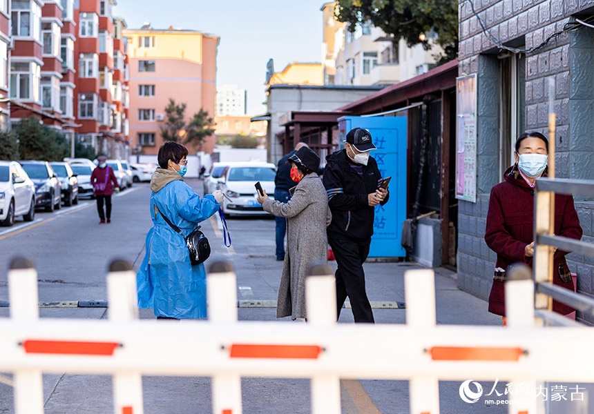 呼和浩特市玉泉區(qū)一處住宅小區(qū),社區(qū)網(wǎng)格員在查驗(yàn)準(zhǔn)備去核酸檢測(cè)點(diǎn)居民的健康碼。丁根厚攝 -